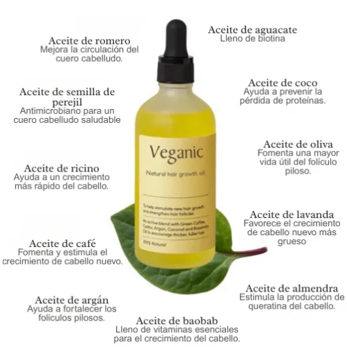 Veganic es un aceite capital 100% natural formulado para reducir la caída y estimular el crecimiento desde la raíz. Su exclusiva mezcla de aceites premium – como romero, ricino y café- fortalece y nutre el cabello, dejándolo mas grueso, fuerte y brillante