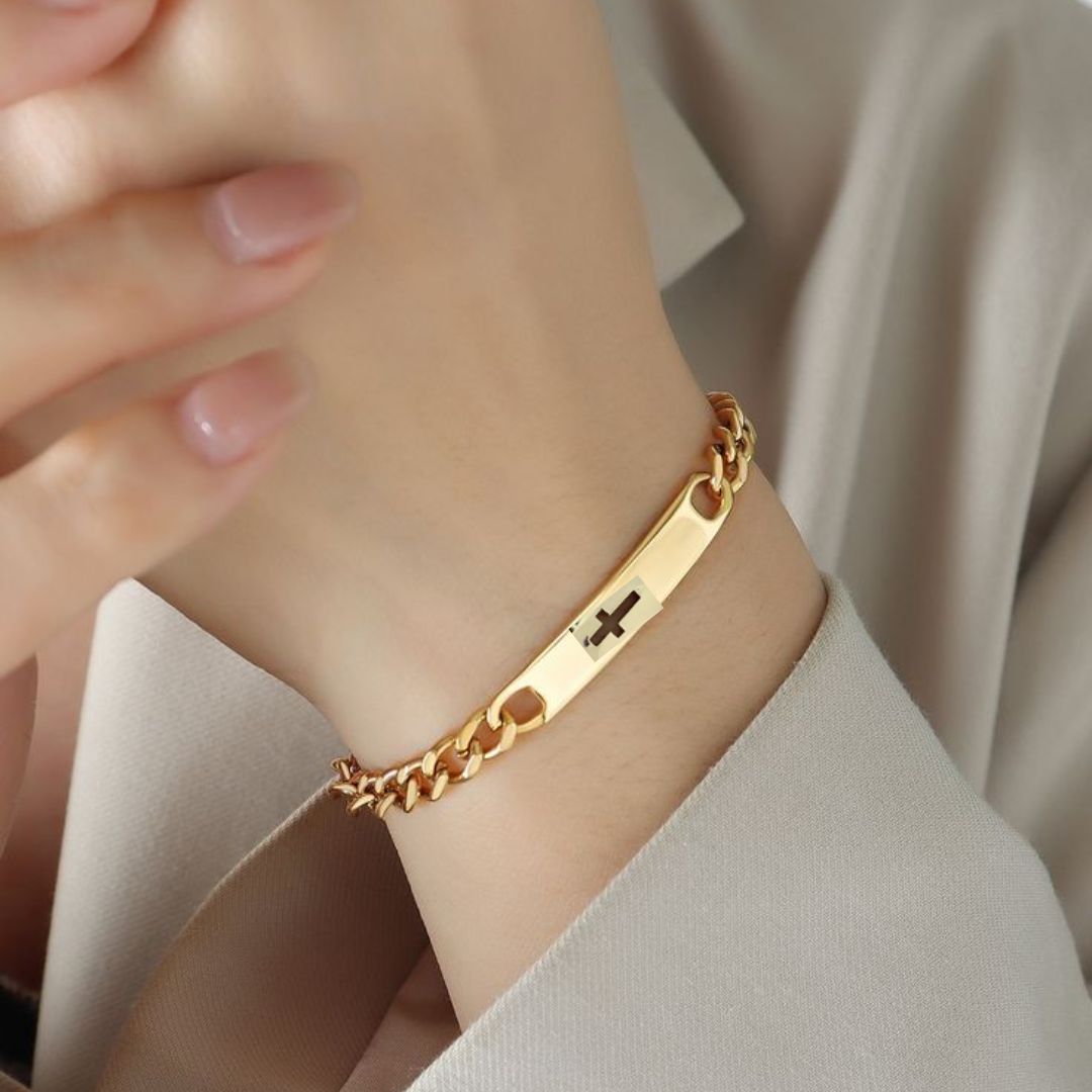 Material : composición de Acero y titanio con una capa de Oro puro que hace que la prenda sea dure más que la joyería convencional.
