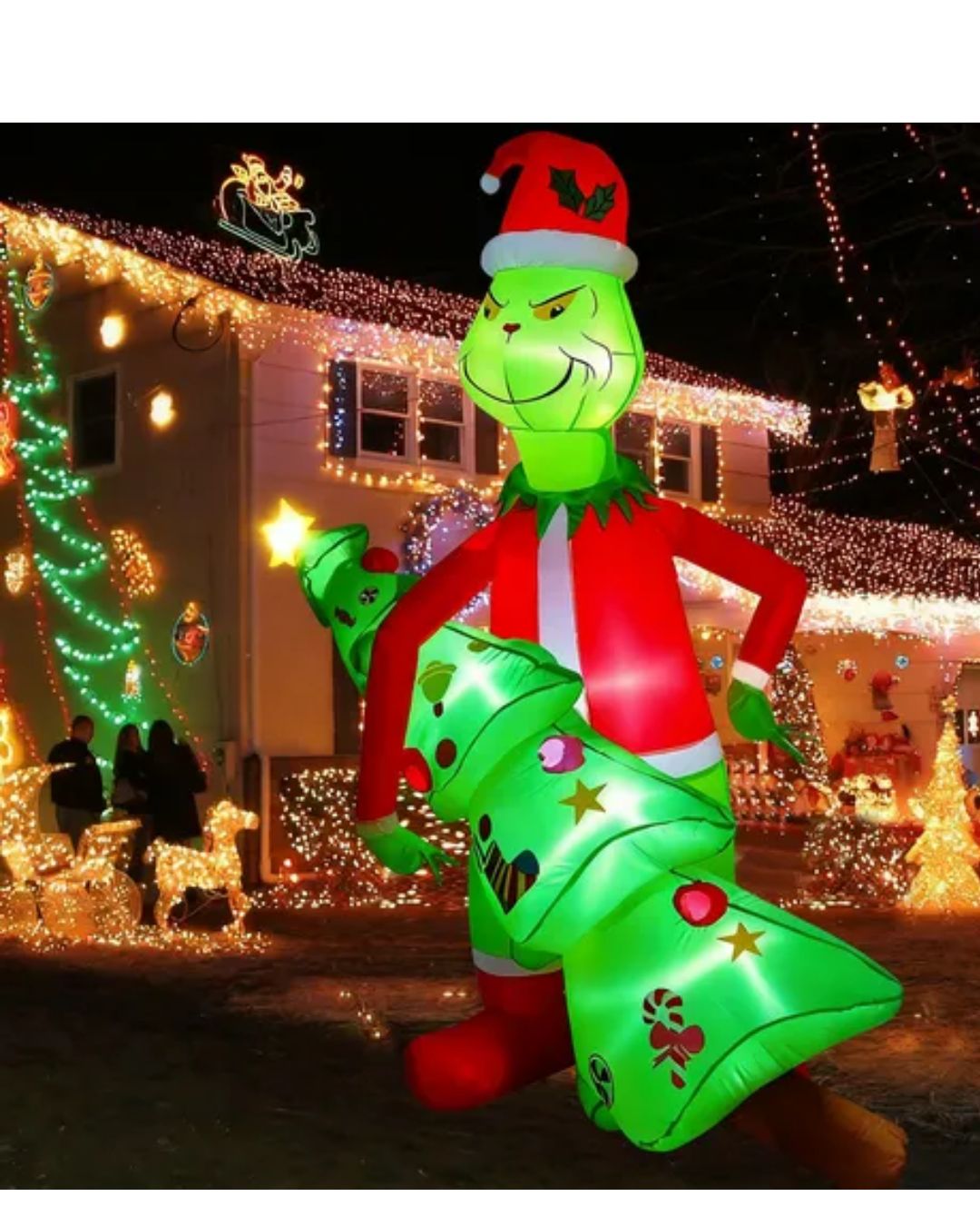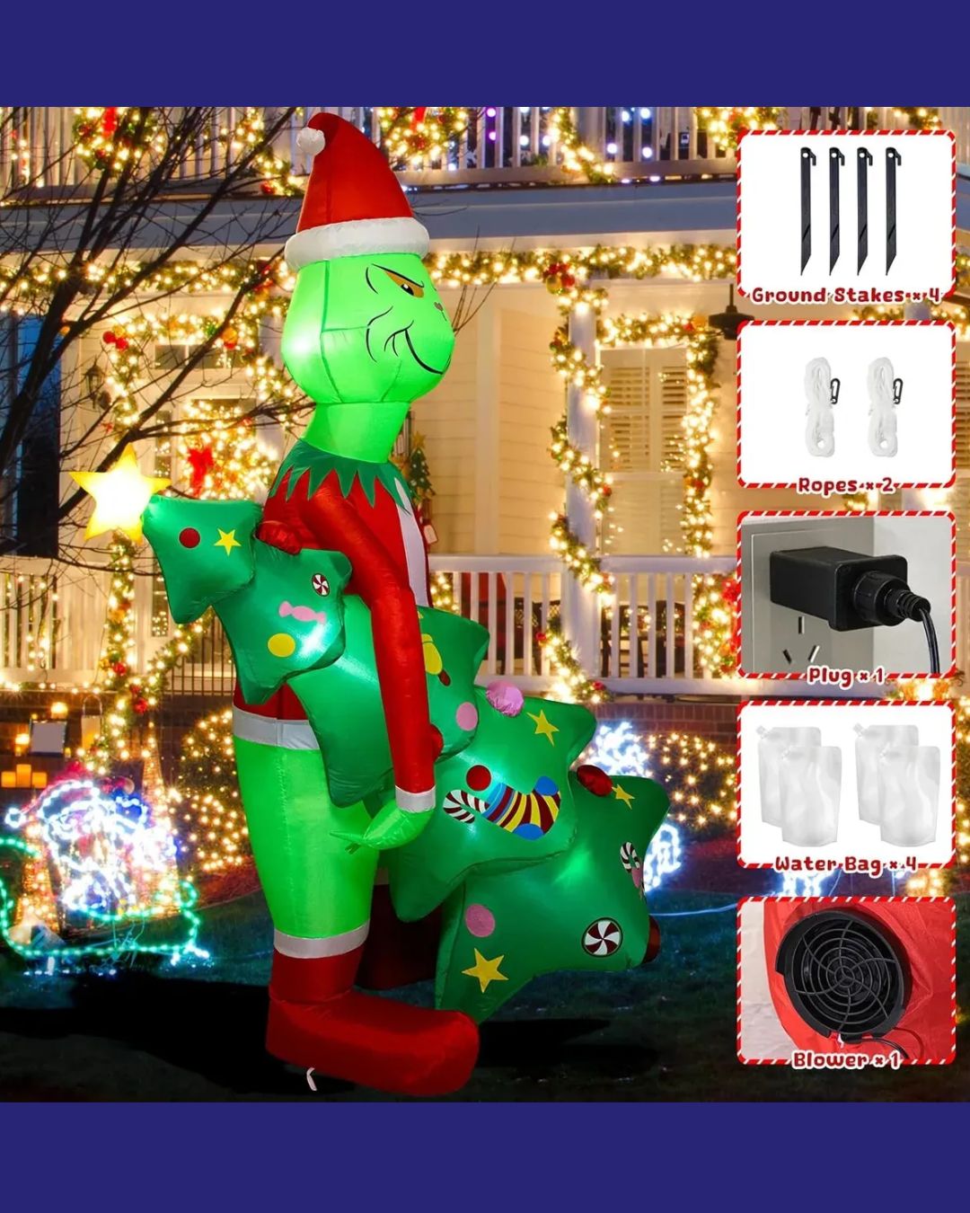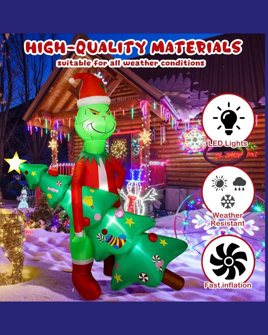 agregue un toque de risa y alegría a sus decoraciones navideñas con nuestro GRINCH roba arbol Navidad inflable de 2.1mts. Esta llamativa exhibición muestra a grinch llevandose el árbol , creando una escena memorable y divertida para que todos disfruten.
