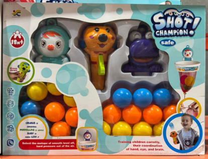 Este divertido set de tiro con pelotas está diseñado para niños mayores de 18 meses. Incluye coloridos lanzadores con forma de animalitos y suaves pelotas de espuma, ideales para jugar de manera segura en casa.