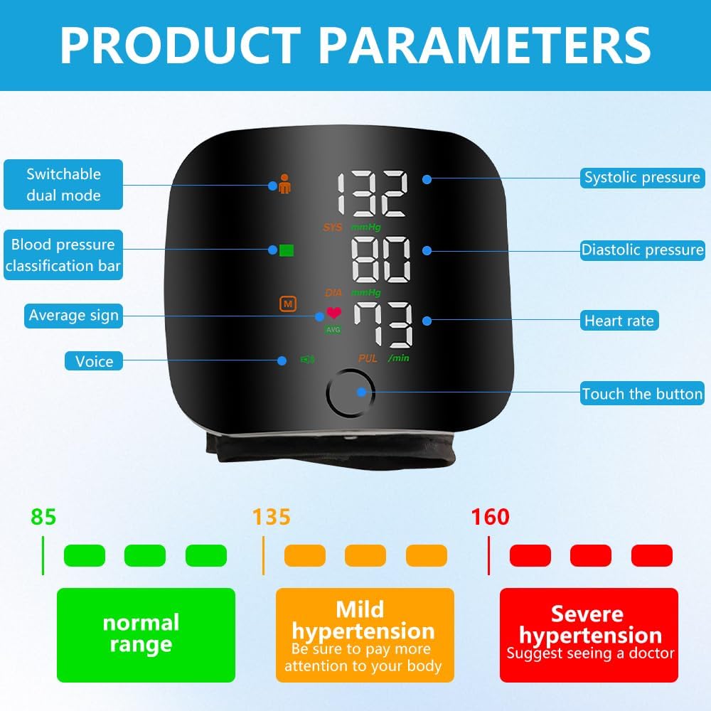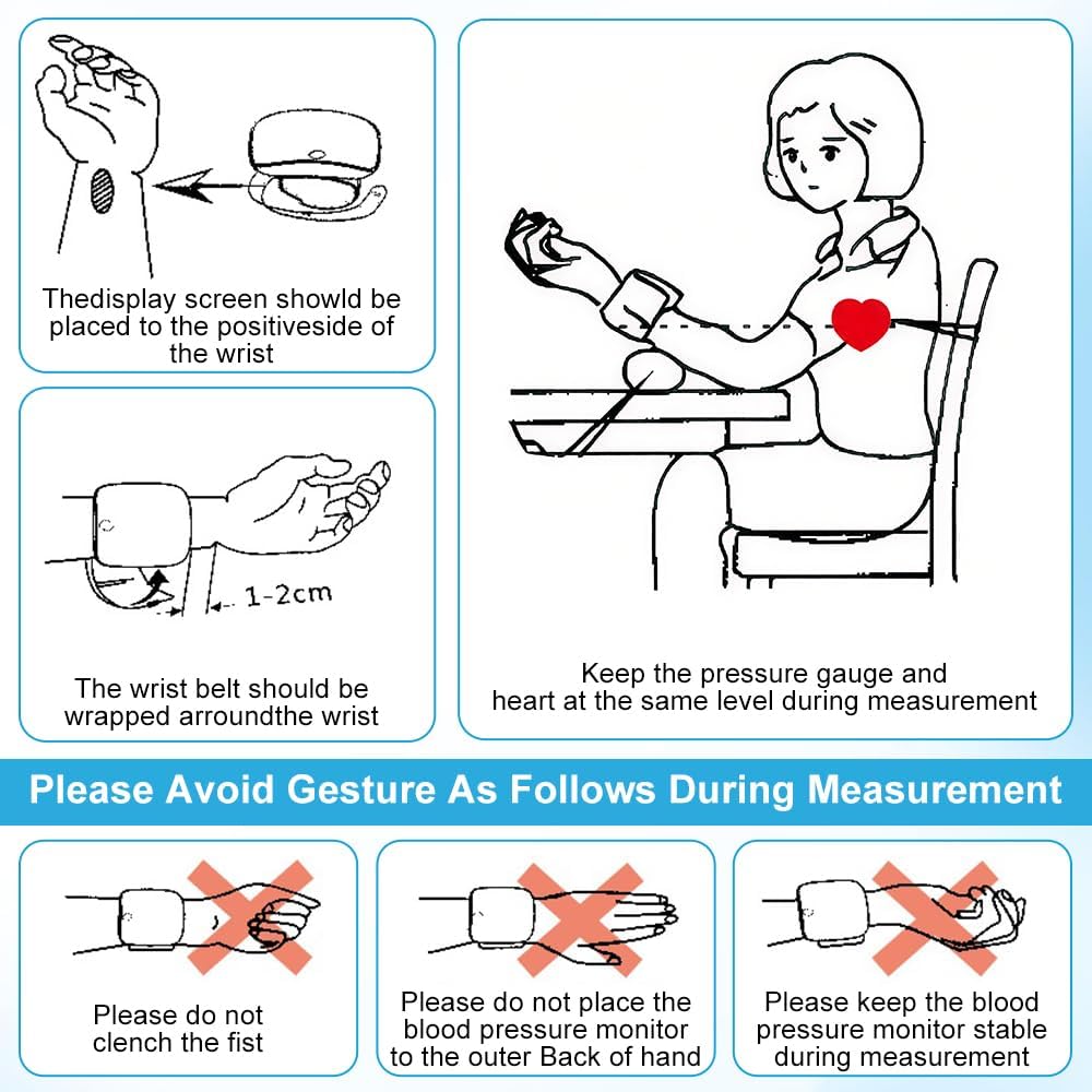 - Lecturas de precisión: el monitor de presión arterial de muñeca utiliza tecnología avanzada de chip para garantizar la precisión y fiabilidad de cada medición, lo que te da tranquilidad mientras monitoreas tu salud. Consejos: la diferencia entre la presión arterial en la muñeca y el brazo suele ser de entre 10 y 20 mmHg. La diferencia entre la presión arterial en la muñeca y el brazo suele ser normal. Tomar el promedio de 3 mediciones será más preciso