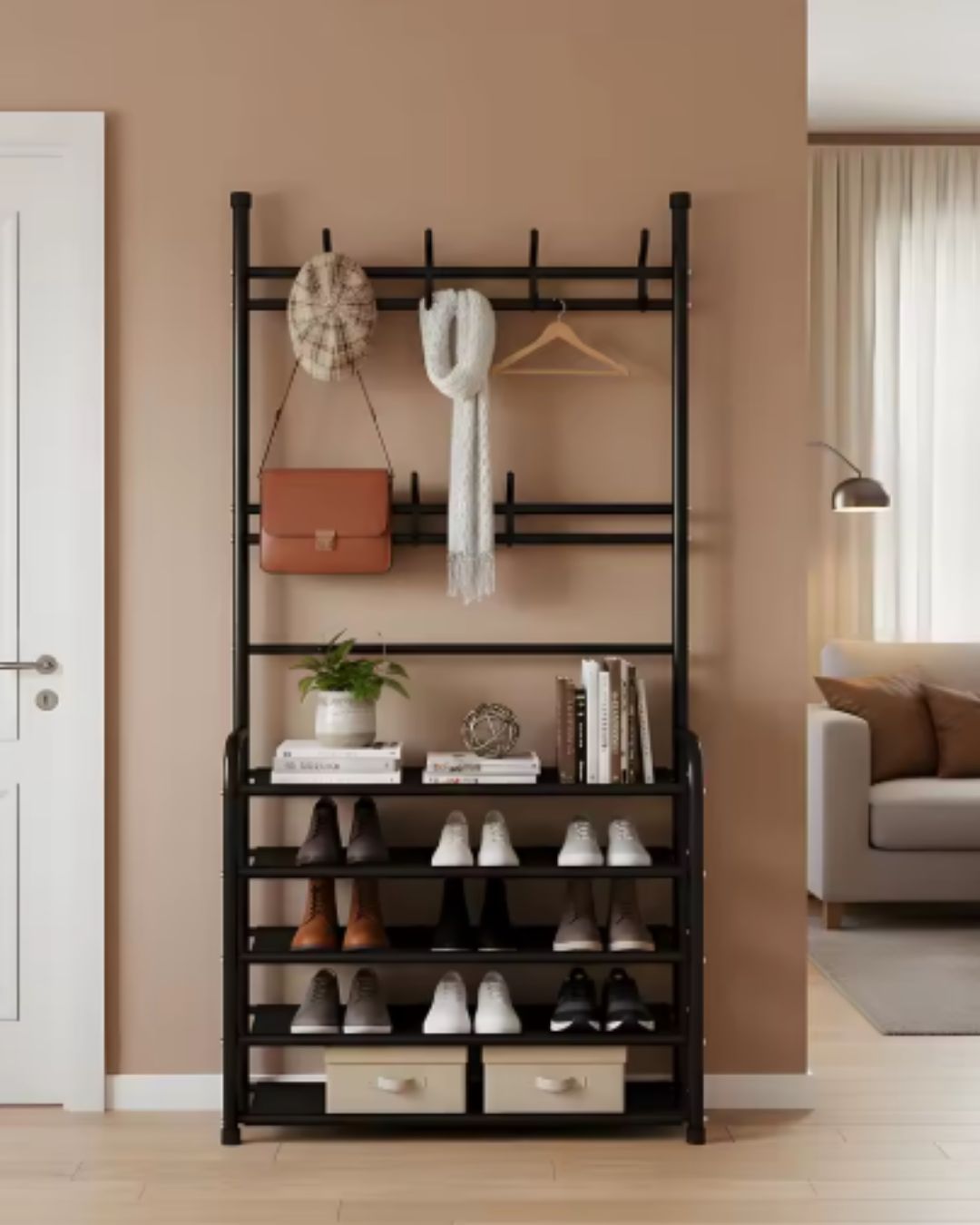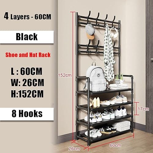 Capa inferior: Un zapatero de 4 niveles que permite guardar ordenadamente diversos zapatos, como zapatillas deportivas, tacones altos y botas cortas. También puede albergar libros y cajas de almacenamiento, eliminando así las pilas de zapatos y el desorden.