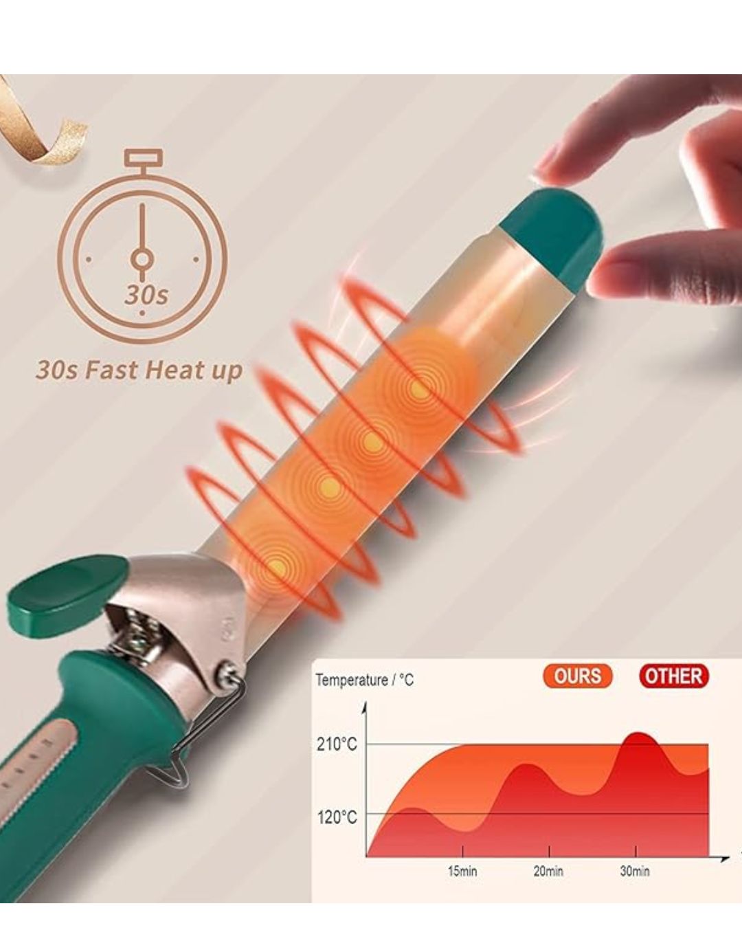 - Calentamiento rápido: la tecnología avanzada de calentamiento cerámico permite que el rizador alcance la temperatura máxima en menos de 30 segundos para un peinado eficiente.