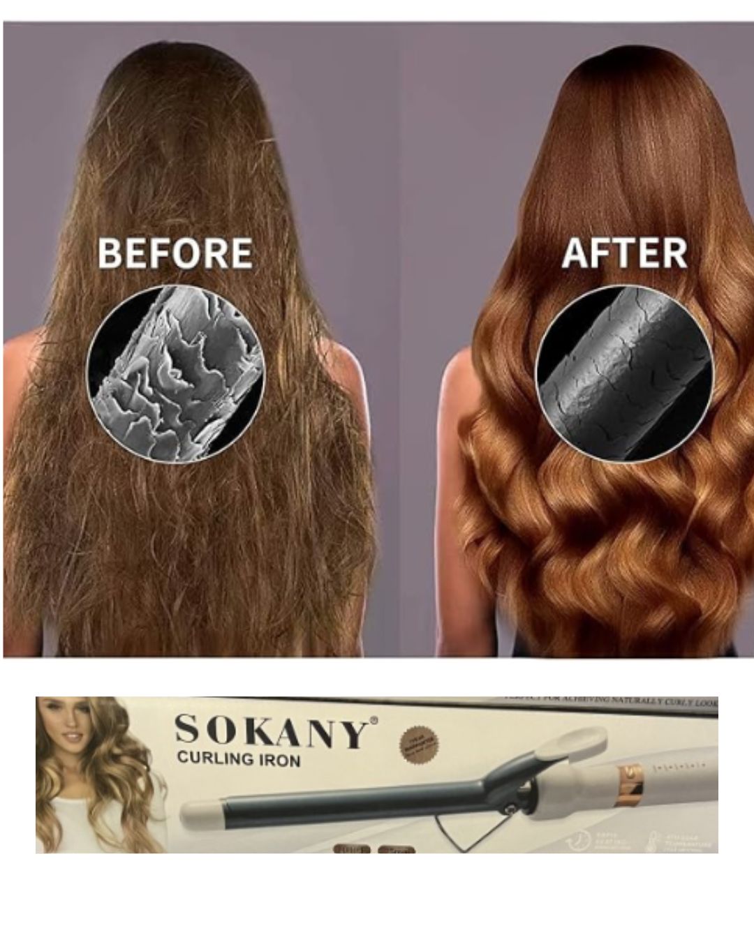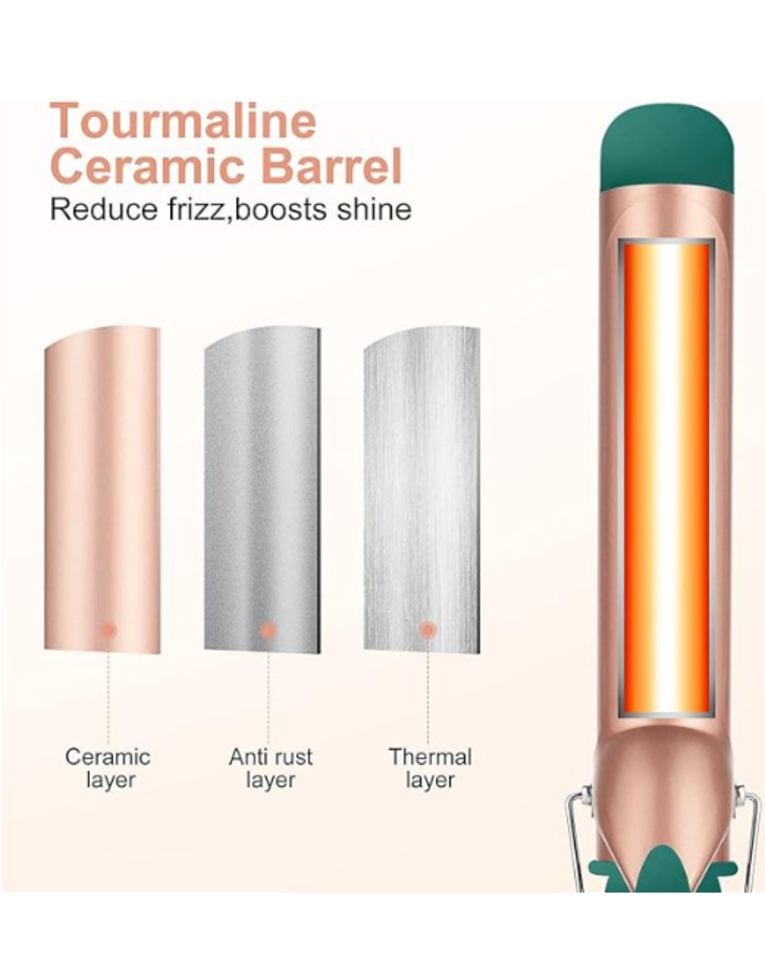 - Tecnología iónica de turmalina: los iones negativos sellan la cutícula del cabello para retener la humedad, reducir el frizz y crear rizos suaves y duraderos.