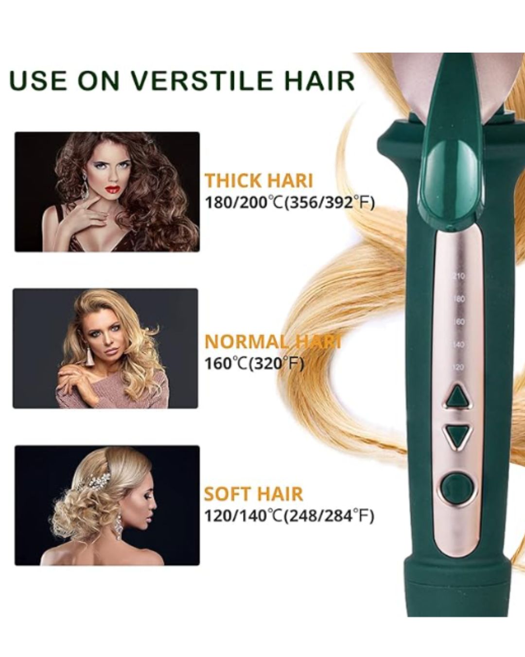 - Control de temperatura de precisión: ajuste el calor de 150 °C a 230 °C (302 °F a 446 °F) en incrementos de 30 °C para lograr el rizo o la onda perfecta para su tipo de cabello.