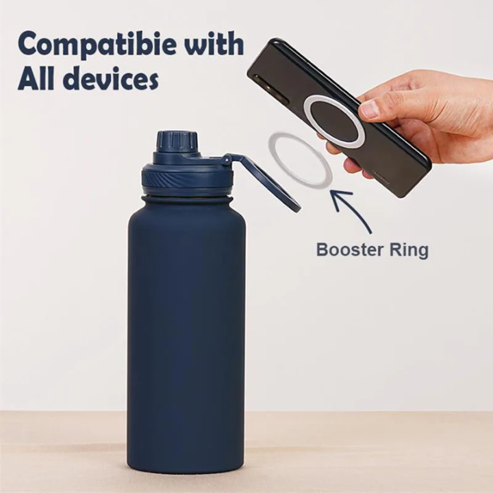 Termo de 1000ml con un soporte magnético para teléfono integrado, diseñado para ser compatible con la tecnología MagSafe y otros dispositivos a través de un "Booster Ring" magnético.